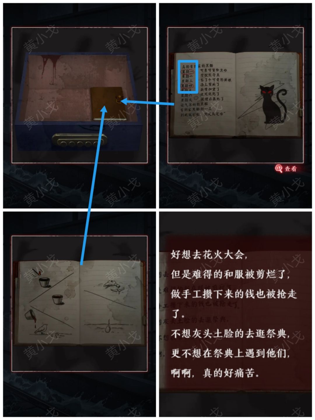 10.点击车票回收箱下方柜子上的密码锁,根据笔记本上的线索(圈红的日期:星期一和星期四),按亮(一、四)按钮