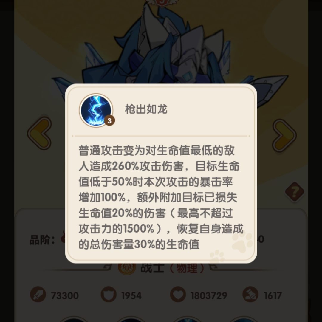 全体属性加成,斩杀加成,战士阵容核心,“当前生命百分比”算是限制了一下伤害,可以说除了云关羽张辽之后优先级最高角色。