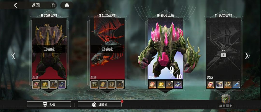 暮光之地共有15个章节,每个章节有多个BOSS关卡,根据战斗搭配策略从每个关卡的三名BOSS中任意击败一名后即可通过,战斗中,不同的阵容会提供多种职业BUFF加成。每场战斗后继承血量、能量,每天可手动重置英雄状态一次,并恢复全部状态