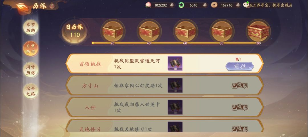 每日历练犹如游戏中的日常事务,基本上每日都必须完成。达成 100 的历练值,便能领取上方的礼包,五个箱子可将资源尽数获取。每日可挑战的次数为两次。