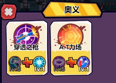 2、 前期推关,优先升级手枪到5级,升到5级之后可以进化成奥义-穿透之枪,然后进化奥义-A.T力场,中间如果没有奥义需要升级的技能就选护身手里剑,好处就是护身手里剑攻守兼备。反正有奥义就凑奥义,没有的话,就看有没有护身手里剑,其他的就随便选了。
