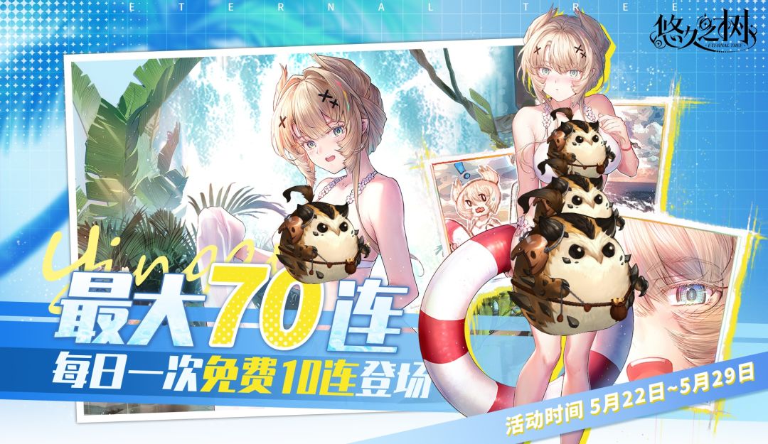 5/22 - 5/29 03:59,每日可在限定角色「与你相伴的夏日真龙 · 盈缺」许愿池中进行1次免费10连许愿,最大70连!