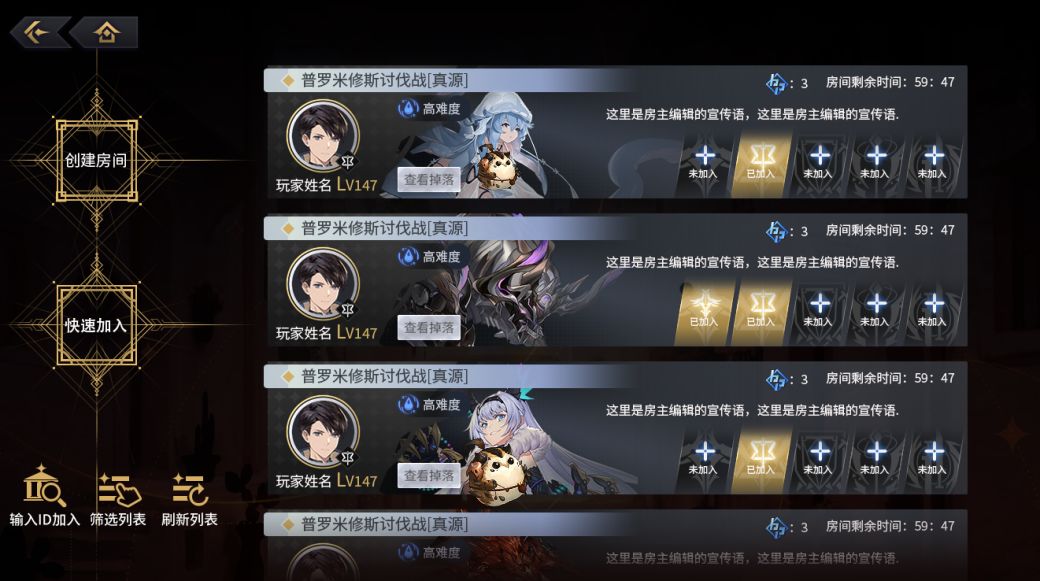 探求者大人们可以在这里查看当前存在的全部房间列表。在该入口下,房间信息的快速预览显示得到了优化,详略得当,更加易用!同时搭载了筛选功能,探求者大人可以在此设置条件,以筛选出更符合自身期望的多人联机作战队伍。