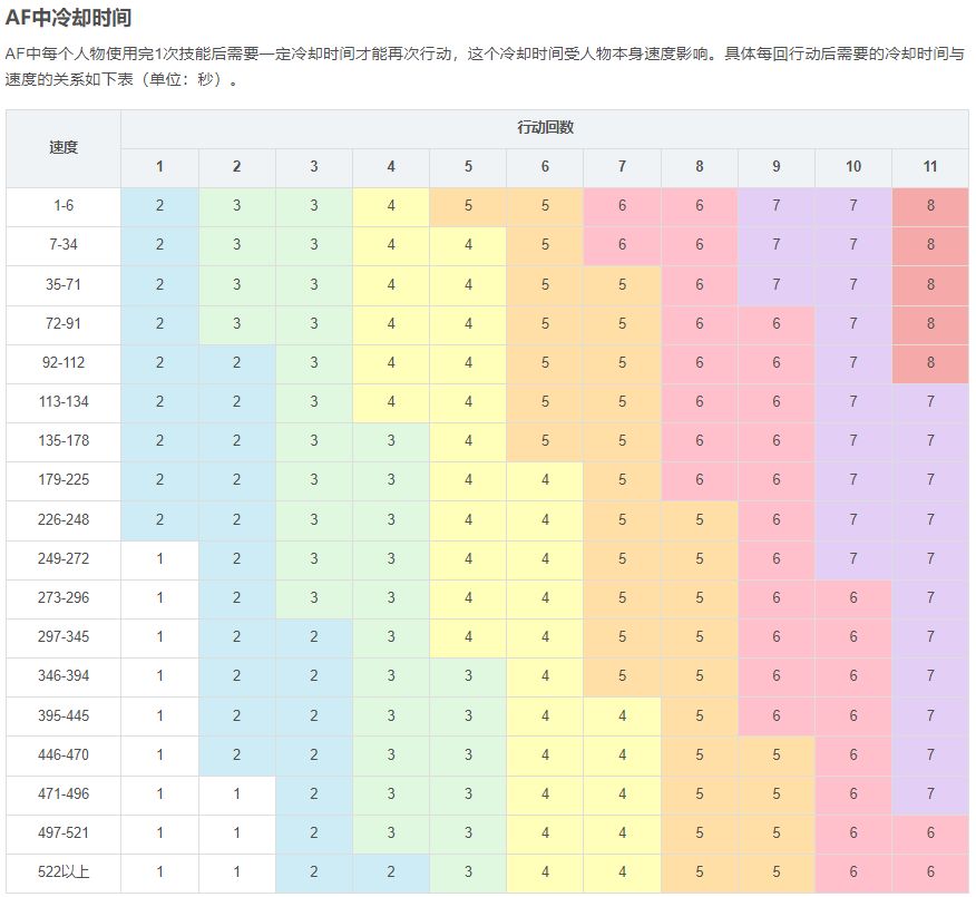 在AF里,每个角色用完技能后,经过一定冷却时间可以再次释放技能(以自身速度为计量单位,见下图-AF中冷却时间表)
