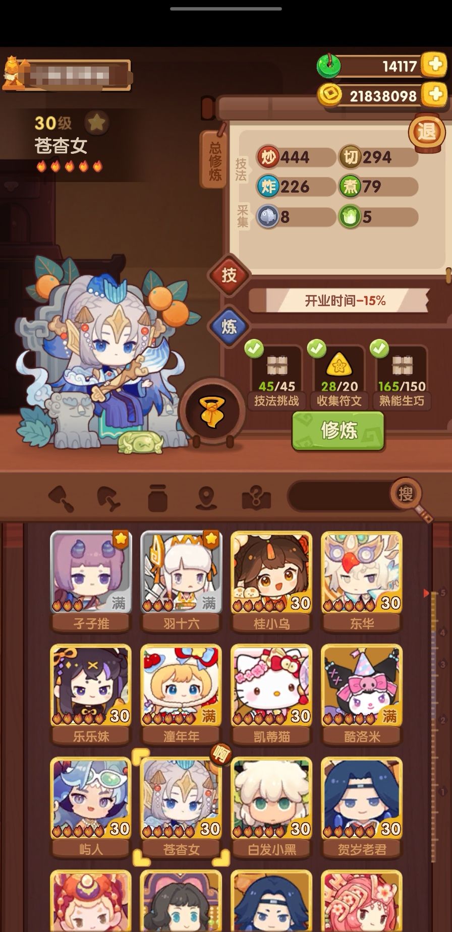 新活动期间补了情人节池,用松鼠桂鱼刷了利刃,修了倾红,凯蒂猫终于可以修炼了,菜谱:青柠金汤翅捞饭、五圆鸡、得莫利炖鱼,光环:倾红、潼年年,厨具:星月棒,凯蒂猫修炼后安上了去年中秋买的浑星月仪,...