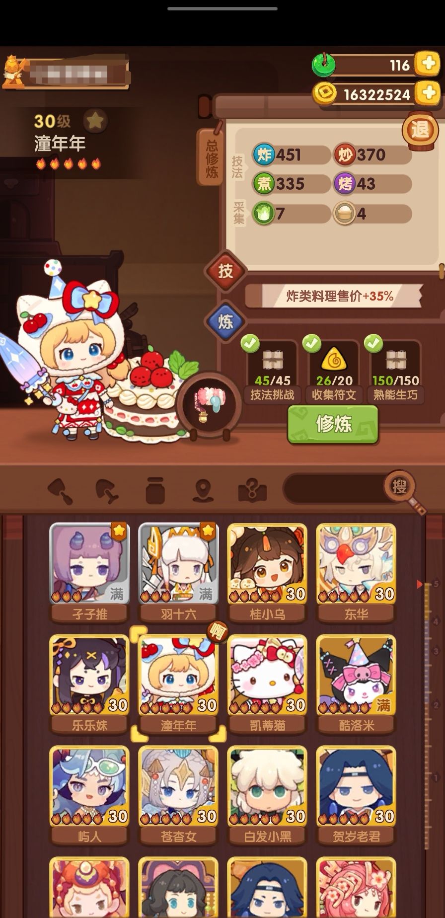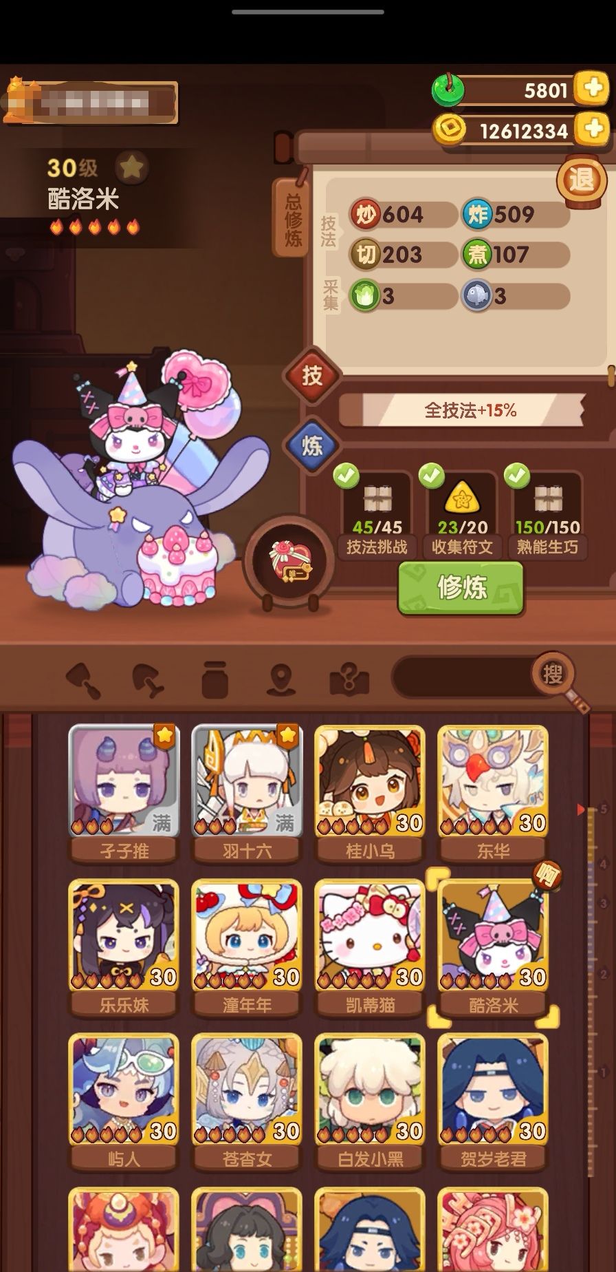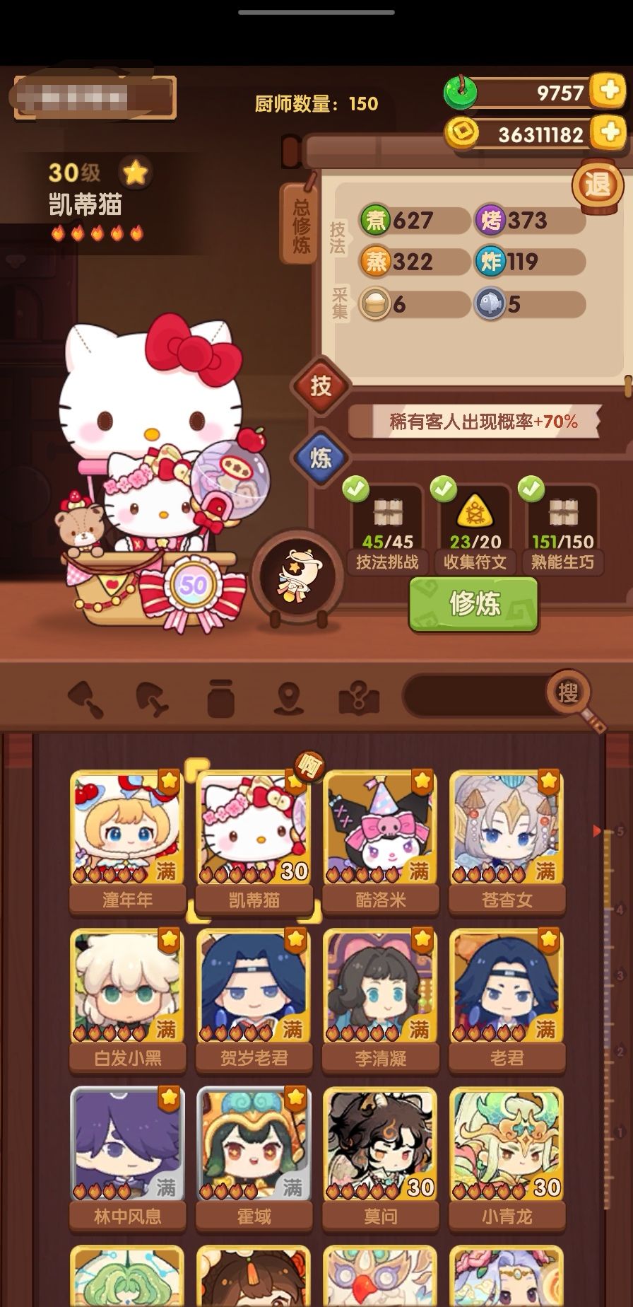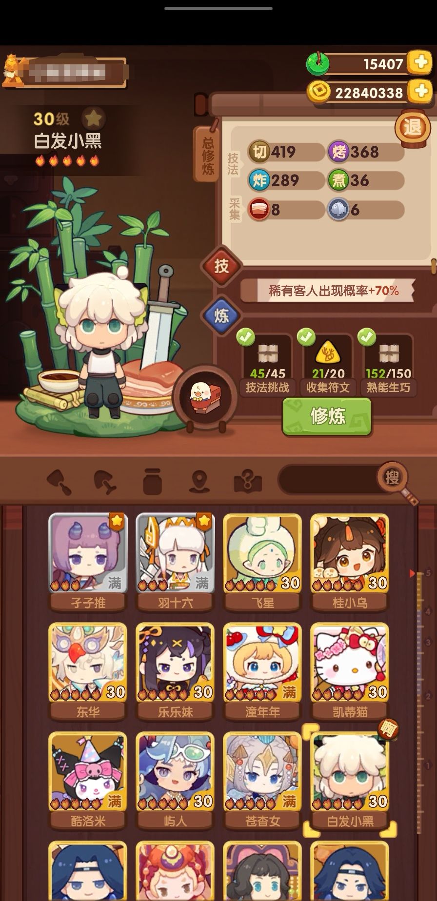 第六个修炼的厨师是白发小黑,修炼菜谱:凯蒂猫生日蛋糕、一条龙和酥皮牛排包,光环:潼年年+50炸,厨具:站鸭封口夹,还修炼了几个+烤技法的厨师。不知道下次抽完新池还有没有玉璧让我补补双十一池修炼...
