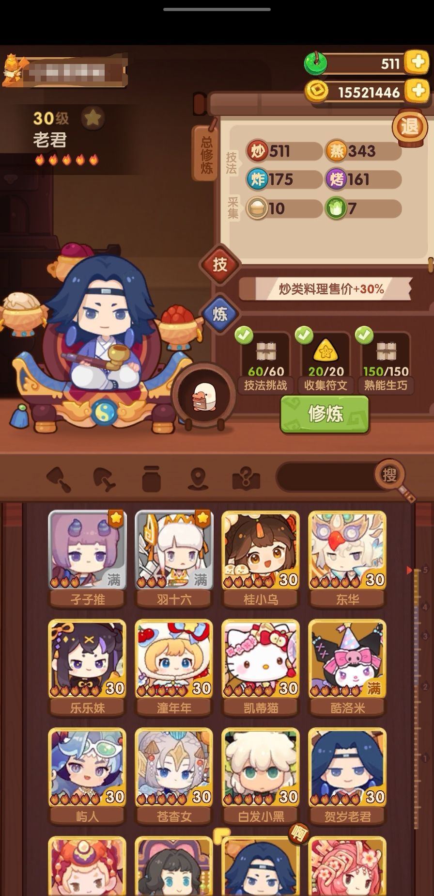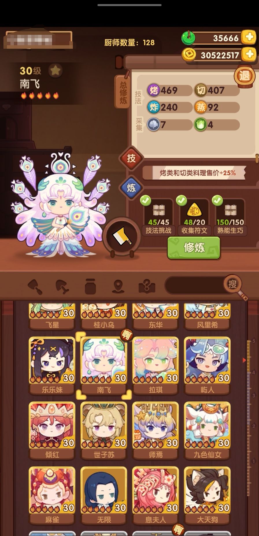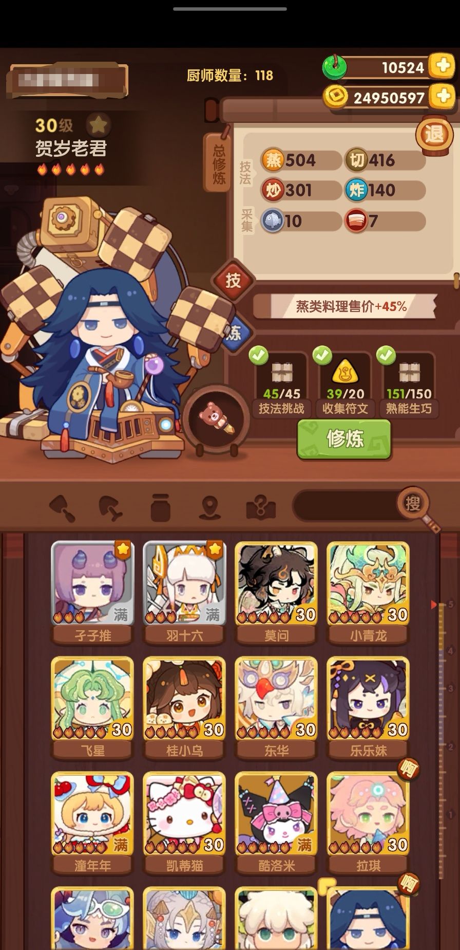 抽了这次新池以后,发现贺岁老君凑一凑也可以修炼了,后续补池计划也更改了一下菜谱:清蒸武昌鱼,罗帷映月,龙井虾仁光环:老君,林中风息厨具:小熊螺丝刀另外还修了几个+蒸技法的厨子凑一些基修,贺岁修...