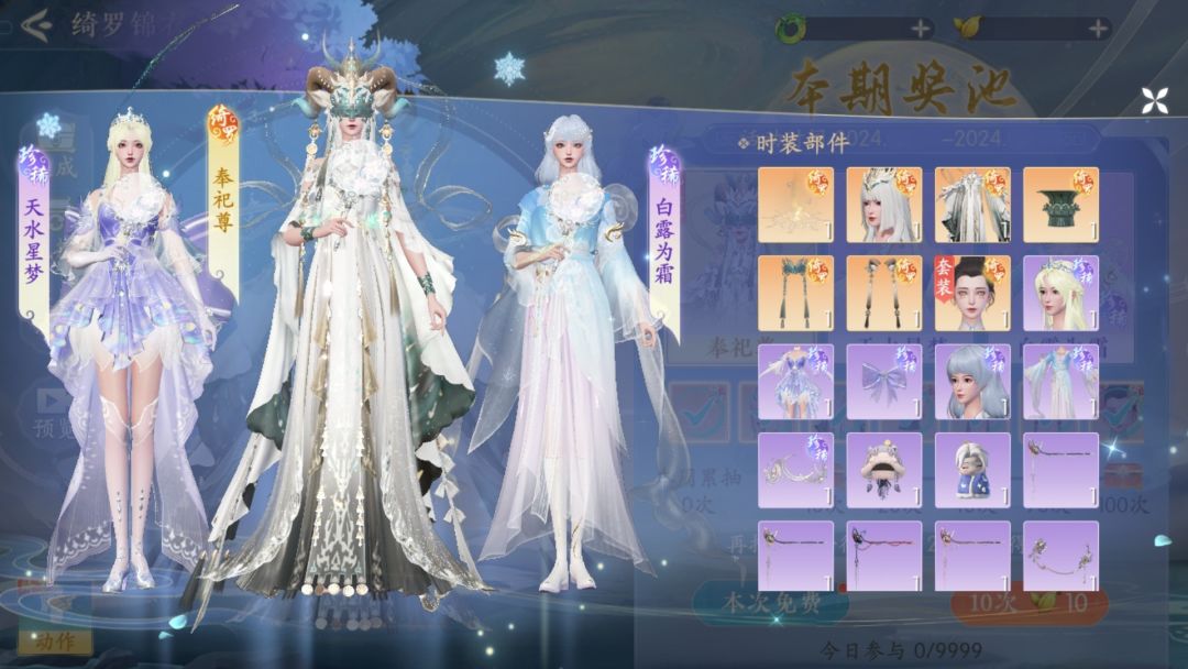 时装【天水星梦】、【白露为霜】及超多精美外观,均可通过参与本期【绮罗锦衣】活动获取,详情见游戏内活动页面。