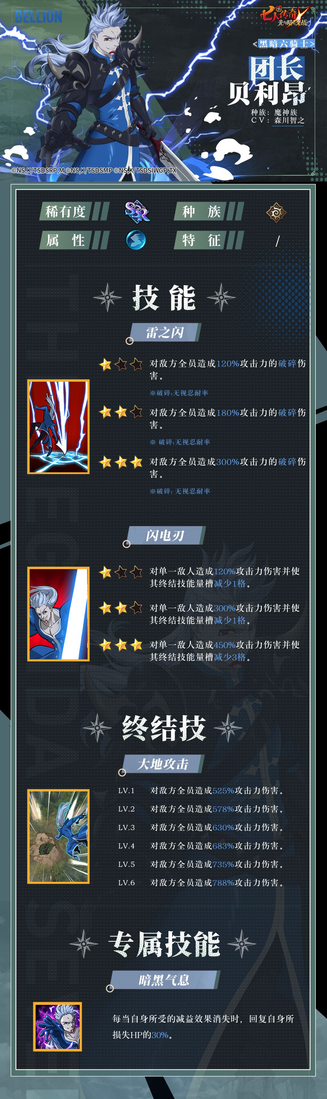 ☛<黑暗六骑士>团长 贝利昂擅长干扰敌方英雄,削弱其终结技的威胁。利用技能针对性的减少敌方英雄的终结技能量槽,从而妨碍对方使用终结技。他还具备在自己受到减益效果时恢复生命值的能力,能有效地保持战斗力。