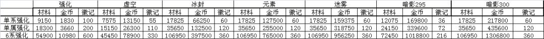 ⑥暗影大陆(预测300版本):一阶段30级,满级50,单系强化至60需要对应材料17825个,金币217800个,徽章60个;单属性强化(例如攻击)至60需要各种材料35650个,金币435600个,徽章120个;全满至60需要各种材料106950个,金币1306800个,徽章360个。