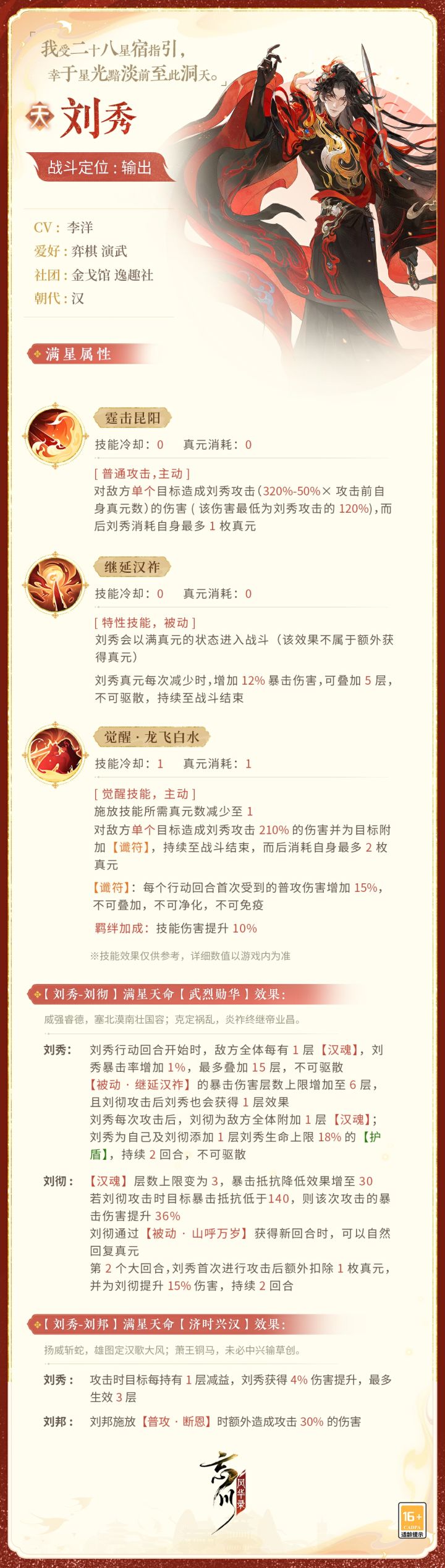 来到忘川后的刘秀将作为输出名士出战,使君大人快戳下图了解详情吧!技能以上线实装为准~