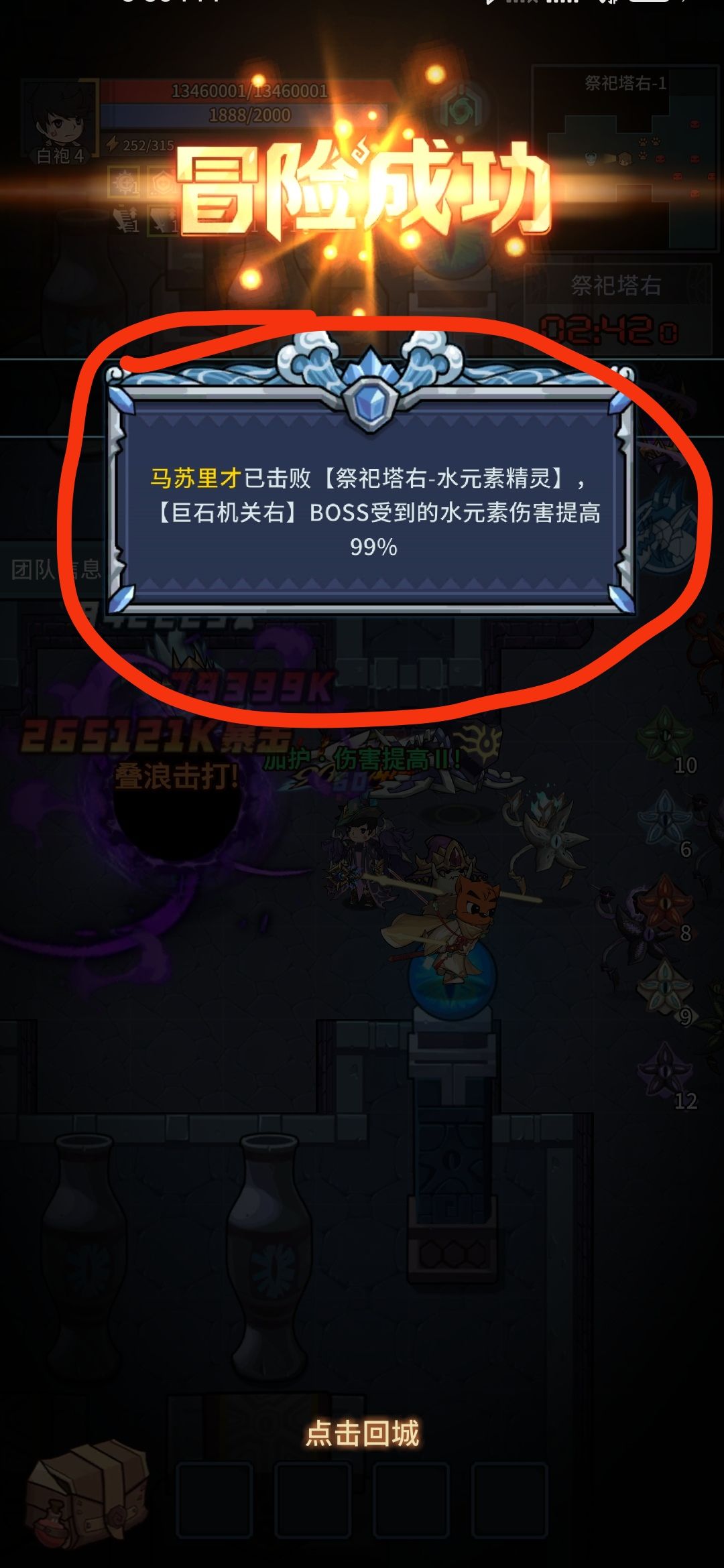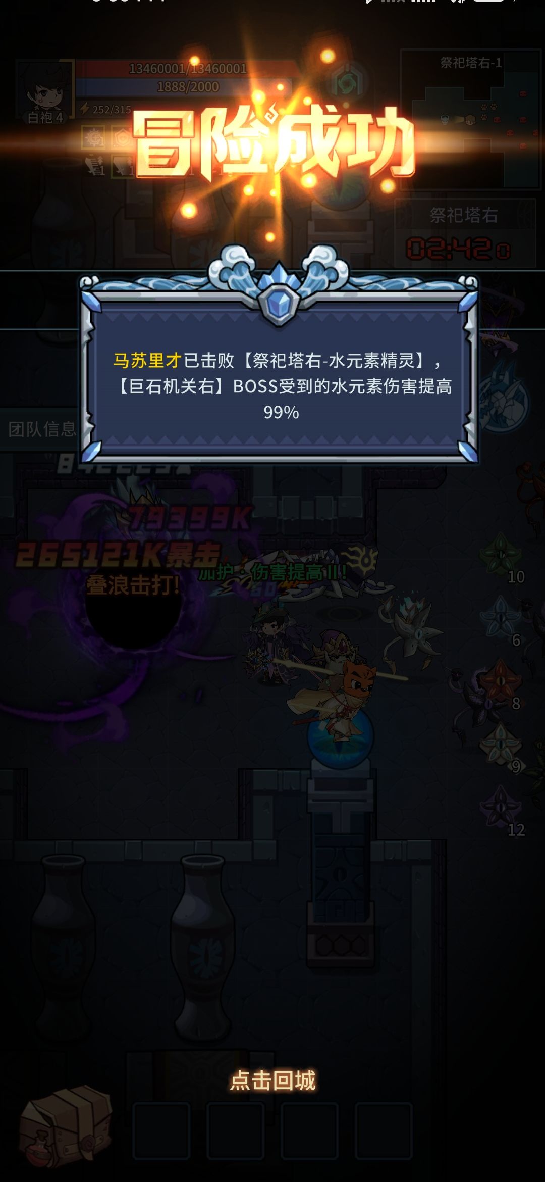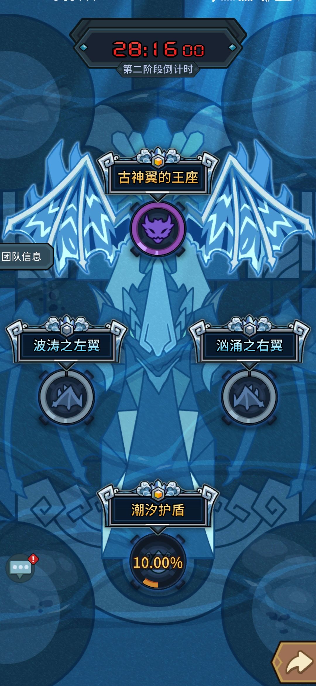 2:团本需要注意合理分配,一阶段先打门,打门优先打右钻一个深海突袭基本上就没了,在用汲魂和魔召打右钻大概15秒就打完,剑士顺序一致。打完门后魔导要优先打祭祀塔里左边的玛修,打完玛修能给巨石古阵增加水伤99%,这样之后打巨石机关非常简单,巨石机关前一关要把小怪打完(打完精英小怪就全部消失),然后boss一个深海突袭就能秒(深海一次伤害2亿多)。如果是剑士就直接巨石古阵boss,打boss等宠物挂上状态就放技能直接秒了(剑士大号一个大狗30多亿)。自己打完之后可以看一下团队信息,看队友有没有打完,看中间的通关次数,可以等等队友。