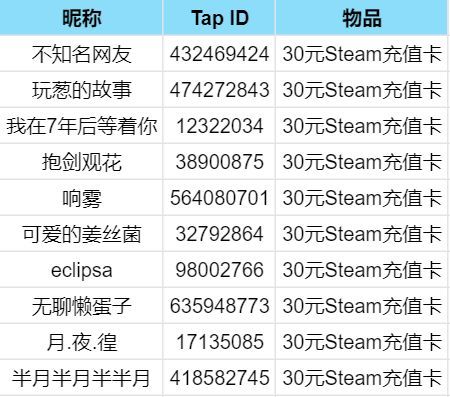 自由投稿环节结束的同时,我们也在所有贡献了TIPS投稿的岛主当中随机抽选了10人,送出价值30RMB的Steam充值卡*1作为感谢。