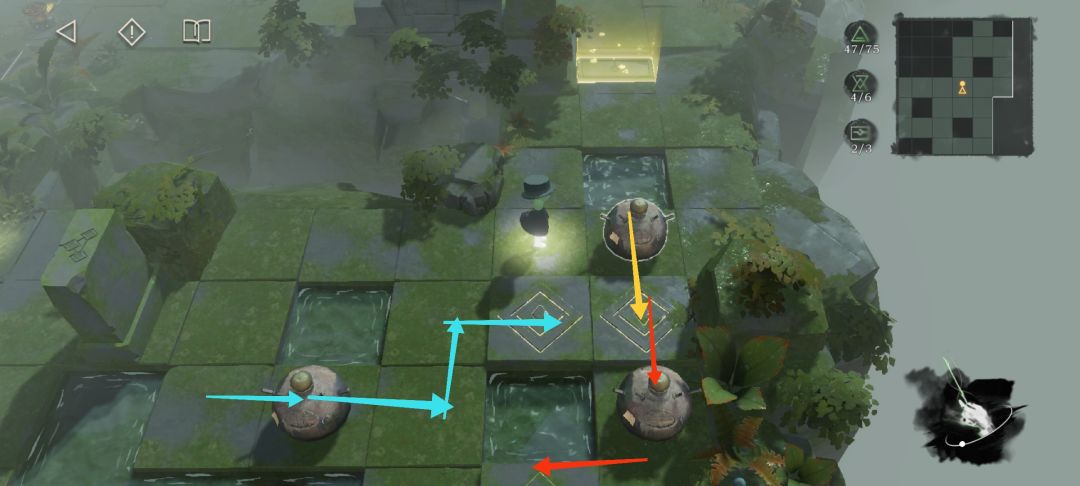走下方的道路,将石球按红,黄,蓝的顺序推或拉向机关,箭头为石球的运动轨迹(做的可能不是非常清楚)