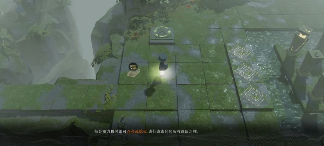 点亮完所有石柱后,再将图中标记的三个机关各踩一次熄灭所有石柱,解锁隐藏道路