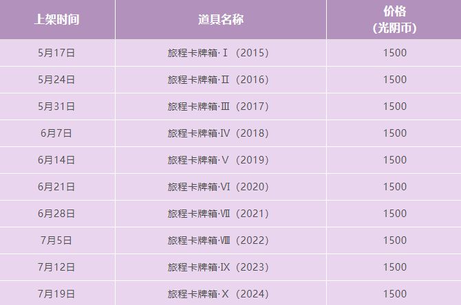 1、2024年5月17日起,每周五5:00,光阴商店都将上架1个2015-2024年对应年份的“旅程卡牌箱”(售价1500光阴币),活动期间将上架共计10个“旅程卡牌箱”;