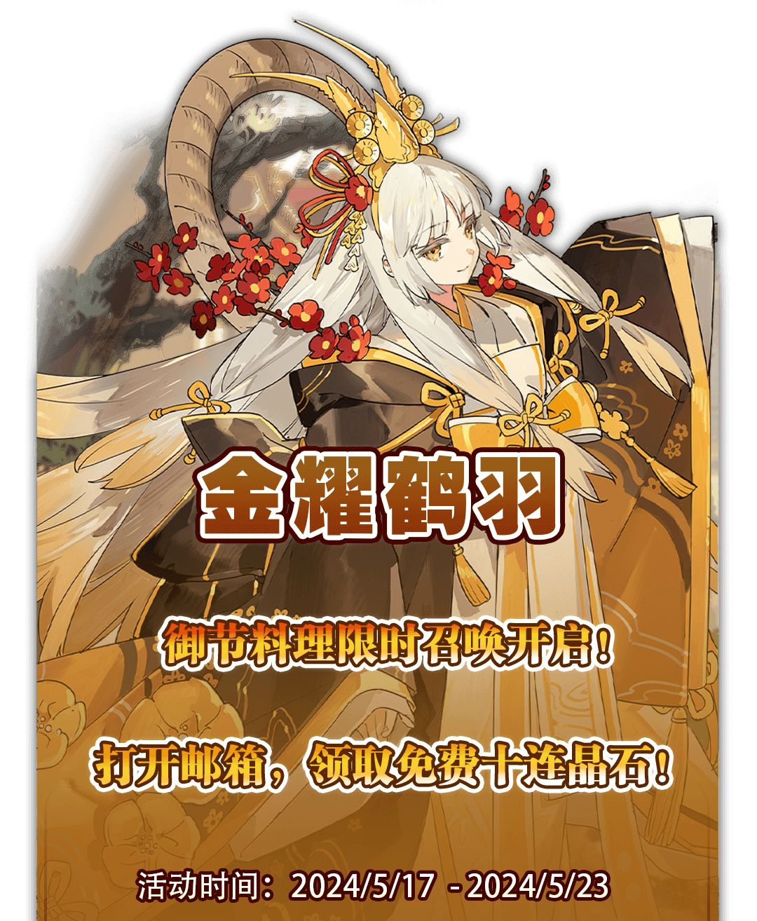 注:御节料理召唤晶石限定在本次御节料理限时召唤卡池进行十连召唤,请于5月23日23:59前使用,过期将自动作废。