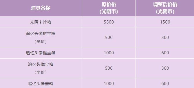 2、光阴商店道具价格调整:2024年5月16日版本更新后,我们将对光阴商店的部分道具价格进行调整,并在更新后的3个工作日内,对所有用原价格兑换过相应道具的玩家进行对应差价的光阴币补偿,具体调整内容如下: