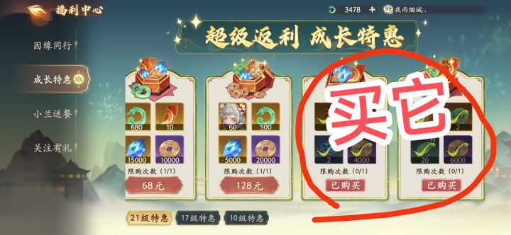 仙玉不要抽卡,买福利中心→到等级后的成长特惠礼包