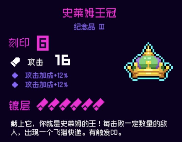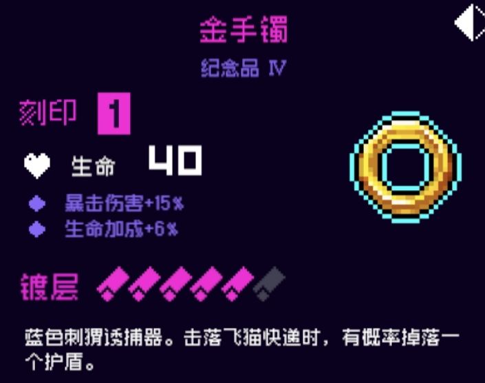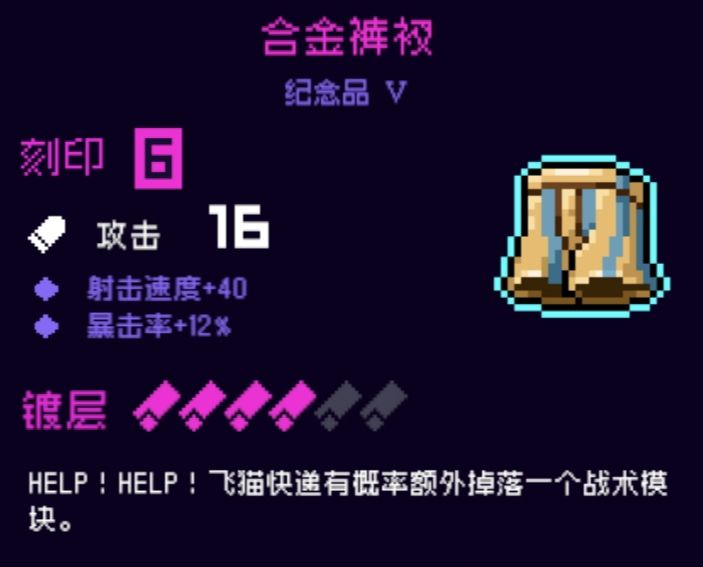 本次up池的主up紫色纪念品,每击败2个(满镀)敌人会出现一个飞猫快递。用于霓虹风暴的快速启动,属于比较重要的一件纪念品,如有必要请务必拉满。