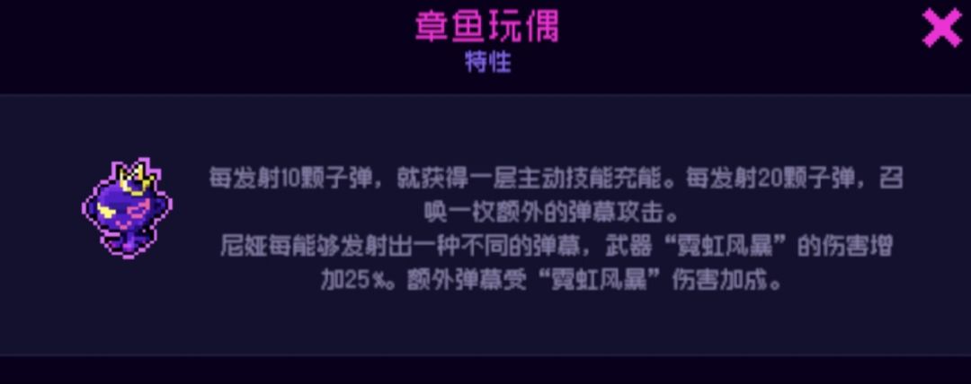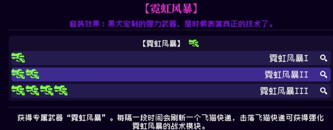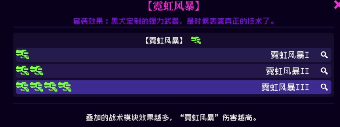 霓虹风暴为普通的弹幕武器(吃到的武器伤害加成会减半),主要是为了给套装效果铺路而设计↓