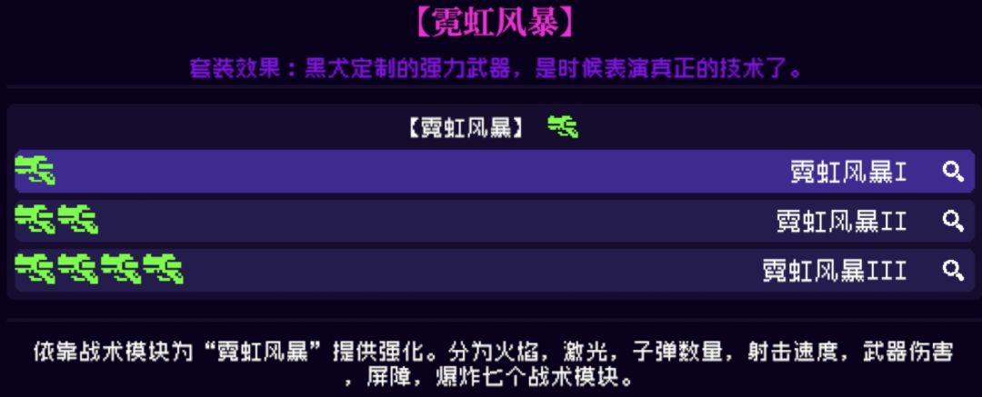 首先是霓虹风暴的1件套效果:可以通过掉落的战术模块强化枪械,一共7种效果。在此之前,先介绍一下霓虹风暴的2件套效果↓