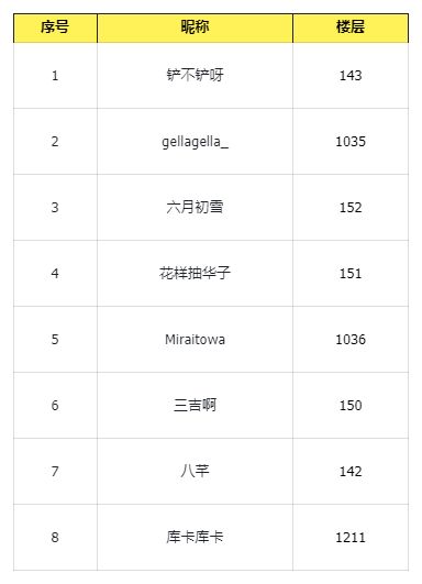 恭喜以下幸运的冒险者获得活动奖励,请中奖的冒险者打开私信功能,工作人员会通过私信联系您,请加获奖群后,登记相关获奖信息,超过7个工作日未登记视为放弃奖励。