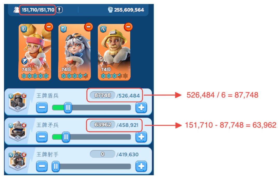 - 如果这样已经超过每队允许的出征上限兵量,那么就应该是 派遣矛兵数 = 出征总量-盾兵数