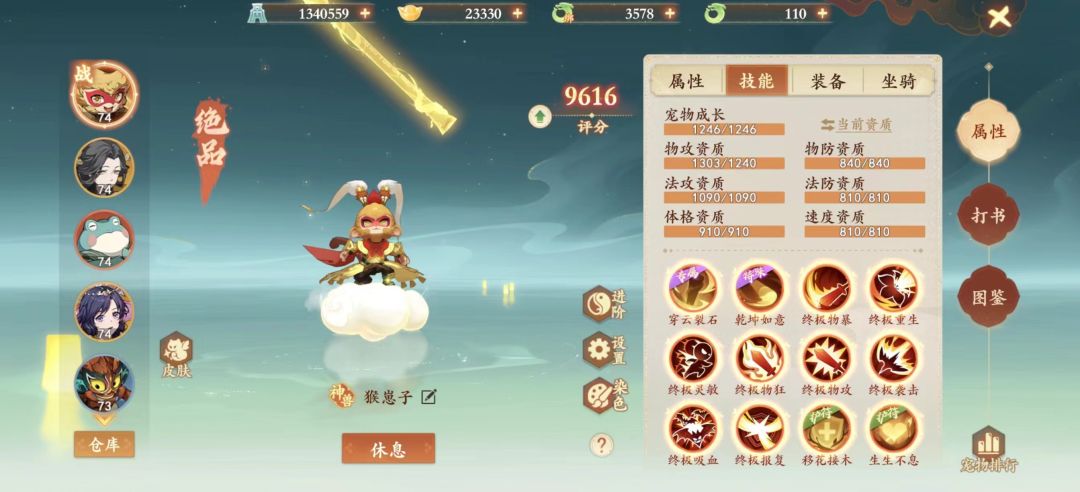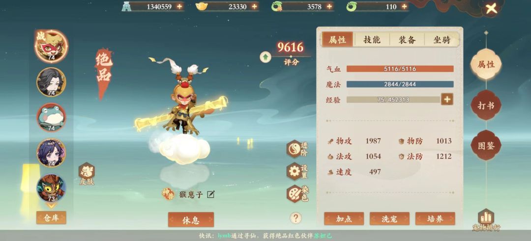 猴子存出来只是第一步,后面还有打书、护符、等等这些,至于宠物怎么加点、如何打书。这些我也不是很懂,经常问别人。我的猴子存出来之后没有着急打书,一直在等护符,护符给到什么技能才能确定猴子走什么路线。护符金钥匙开测到现在一共挖了4个至尊,五六个稀有。现在选择的护符是生生不息+移花接木,具体信息自己去游戏看,我也没记太清,配合上坐骑的护盾技能,做个任务宠还是很奈斯的,坦度很好,妖王跟凶兽还是可以坚持到最后的。不过护符千千万路线也很多,所以建议根据护符给的技能去做宠物。不要奢求去洗护符,一次六万金币,不是氪佬不建议去。