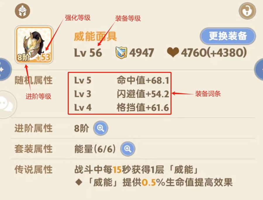 如上图所示,一件装备的属性包含它的等级,强化等级,进阶等级,属性词条,还有套装效果,我们的目的就是在装备打造的过程中提升这些属性。