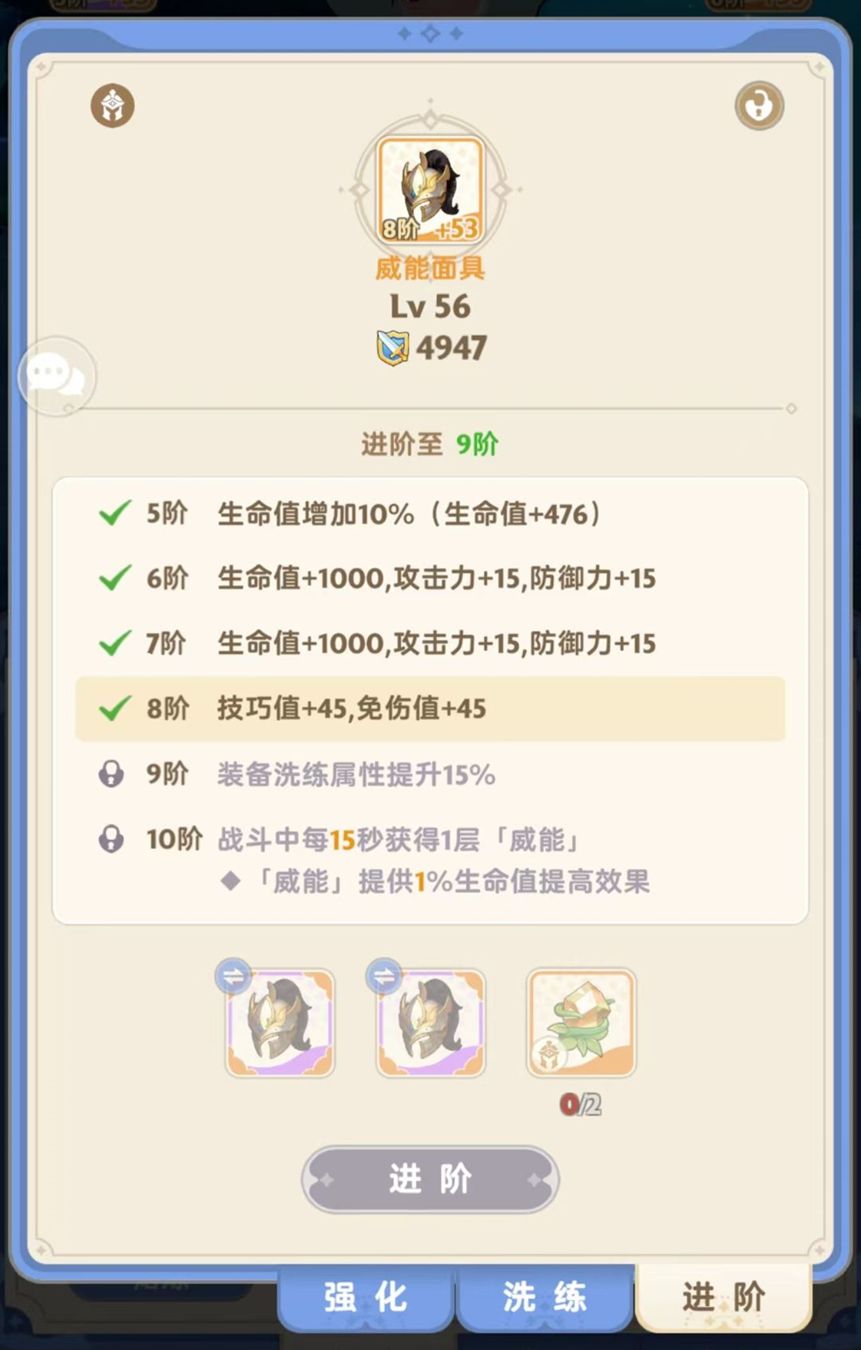 在装备进阶的过程中,有一点需要注意。我这里用紫金色的装备举一个例子。我们知道一个紫金色的装备进阶所需要的同名装备数量为:0到1阶消耗1个,1到2阶消耗1个(0到2阶消耗2个),2到3阶消耗1个(0到3阶消耗3个),3到4阶消耗2个(0到4阶消耗5个),4到5阶消耗2个(0到5阶消耗7个)。在进阶过程中,多余的消耗不会返还,我们需要通过计算来避免材料浪费。