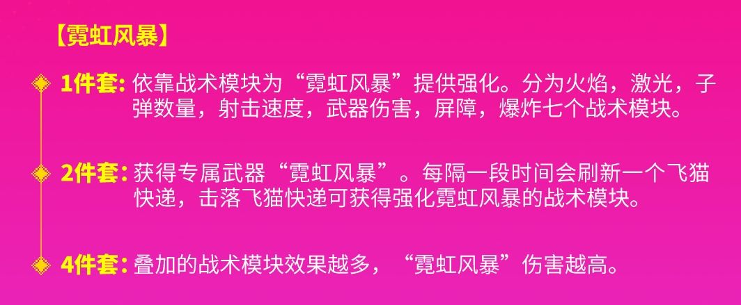 套装效果的话就是凑齐二件套获得一把名为霓虹风暴的武器,并且可以依靠七种模块为其提供加成,二件套还会每隔一段时间刷新一只飞猫(无需进入战斗,也就是说可以用金手镯在空房间回盾