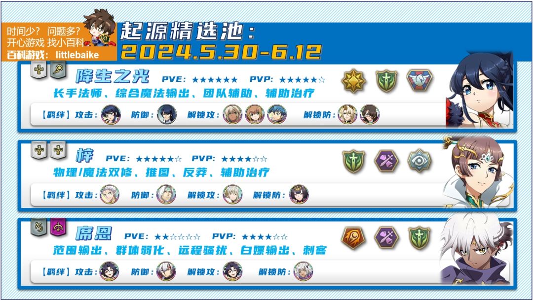 这个池子中降生之光是必抽必练的,没有的话非常建议补一下。梓偏PVE一些,席恩偏PVP一些,虽然都不是顶级英雄,也都能上场。再加上都可以开羁绊,抽到了也不亏。