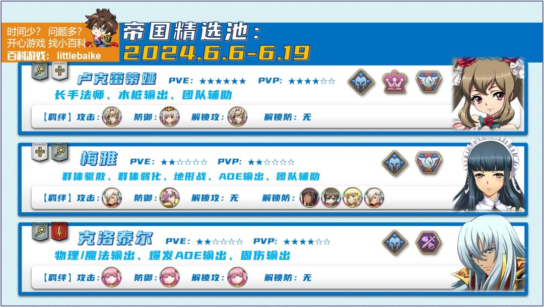 【6月6日】,帝国精选池复刻,卢克蕾蒂娅、梅雅、克洛泰尔。