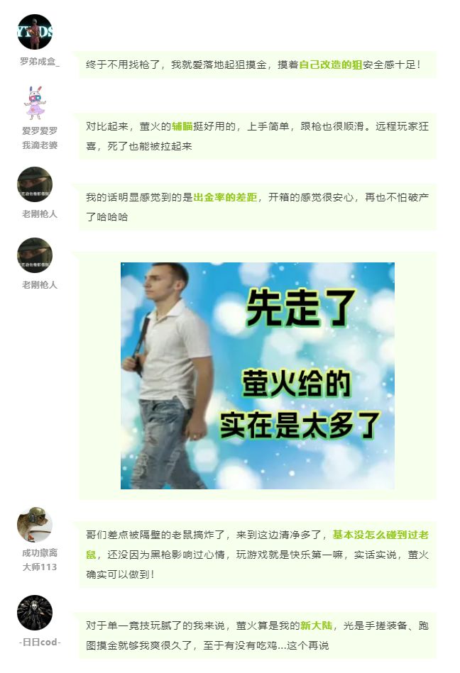 在畅玩萤火后,他们给出了对比后的真实游戏感受与反馈,没想到正向反馈还真不少,好好好!多说,爱听!看来萤火听劝的好习惯没有白白养成!事不宜迟,一起来看看各位萤火虫都说了些什么吧:
