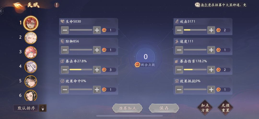注意的点:控制位,跟玉面狐狸都需要极致的速度,其他角色的速度可以均点。
