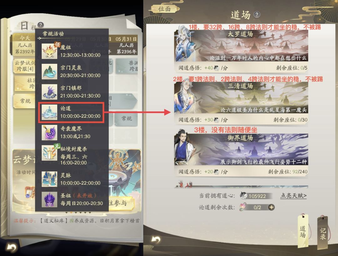 10:00~16:00之间坐论道,晚于16:00坐论道会坐不满6小时。