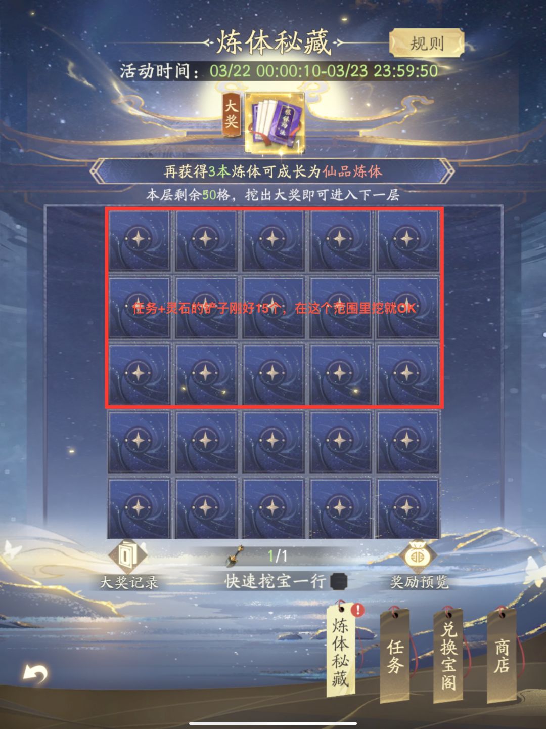 2.日程任务:1类是炼丹-炼体-仙花-灵兽-洗灵-灵装类活动,这种活动就是拼资源数量多少。