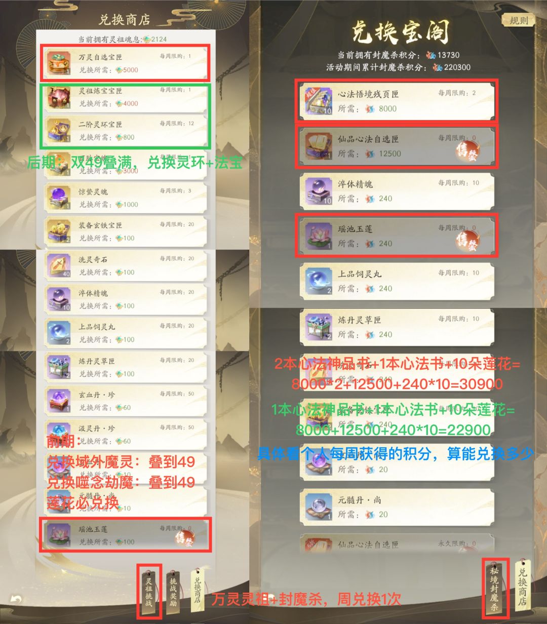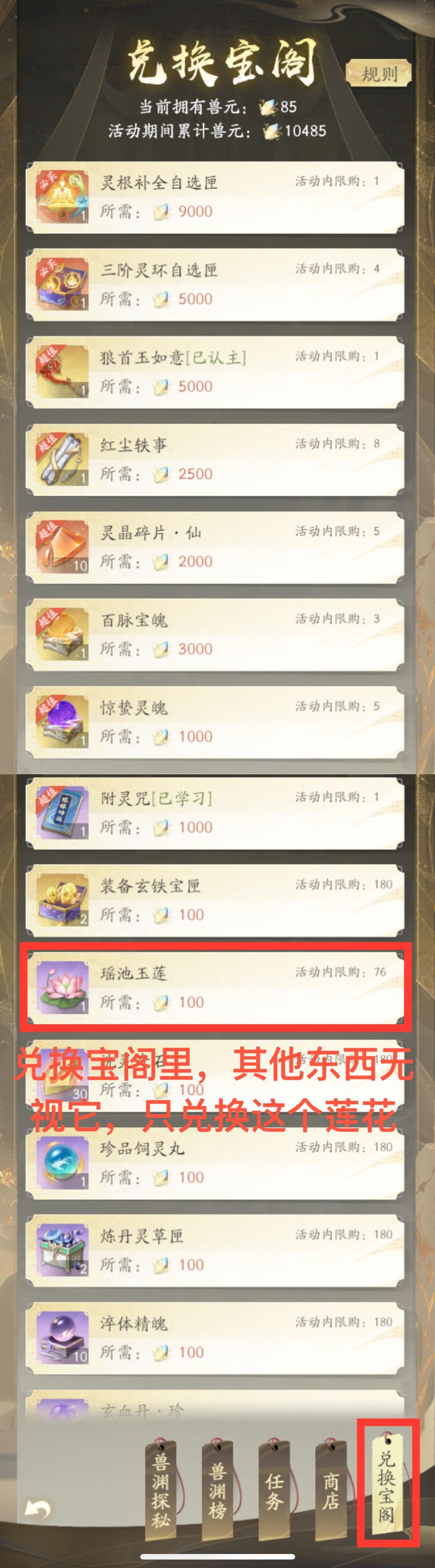 另1类是魔道-兽渊-虚天殿-云梦-天地弈局类活动,这种活动需要在神物园里滴绿液加速材料数量,然后材料再兑换4倍符、探查符等活动道具。拼打活动积分高低。这类活动都有1个兑换宝阁,兑换宝阁重点兑换仙花道具-瑶池玉连,其他东西无视它。