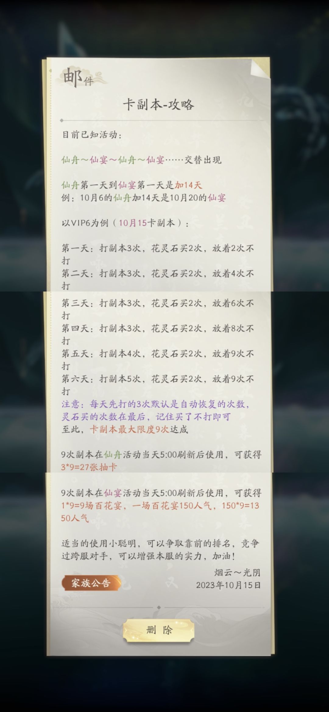 3.每周一个限时3天的大活动,目前我们服是周二开,周四22:00结榜大活动。周六~周一注意存副本次数。1个月有4周,刚好仙宴-唱戏-龙舟-割草占满1个月4周,循环往复。