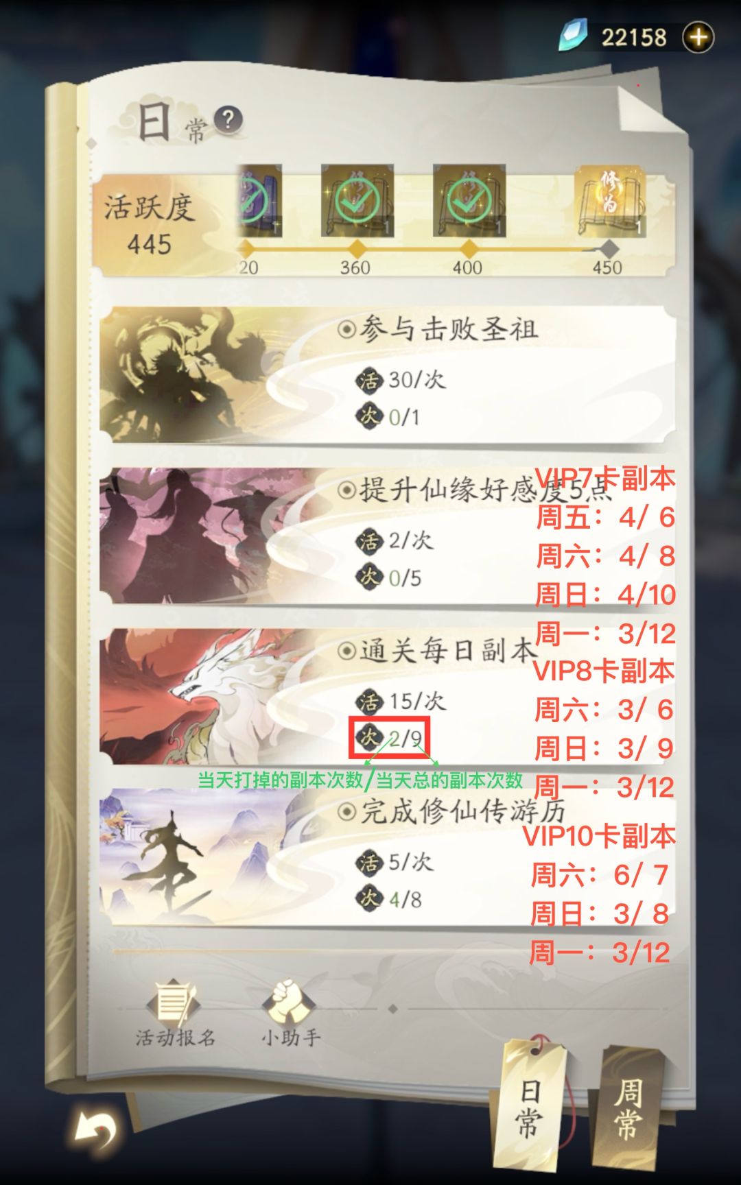 1.日常任务:每天5点刷新,日清,如果不日清,第2天会在“小助手”→“资源找回”里花灵石找回。