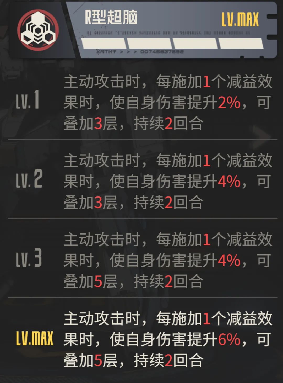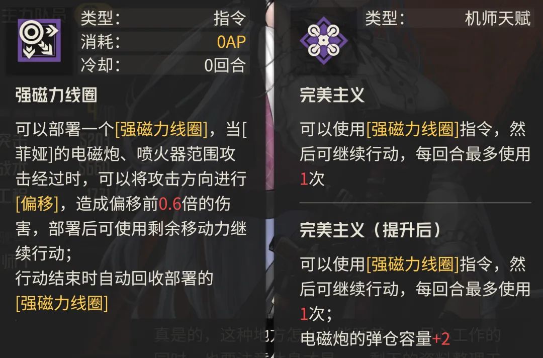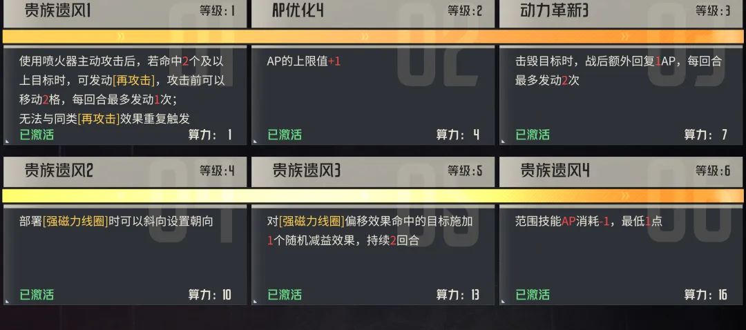 接着菲娅的γ2区质变效果大家可以直接参考上图,1算力上限的作用其实就是让菲娅可以通过喷火器攻击到2人起手,然后完成1回合3动的操作;10算力效果则非常关键,可以斜向偏移攻击将大幅提升菲娅的输出范围与能力,然后16算力的减AP效果也是极为关键,具体的大家可以参考之前的肖妮,因此理论上而言菲娅想要玩得溜,这个γ2区16算力的开启优先级还是非常高的,要不然每回合2-3动的AP消耗真的有点吃不消。