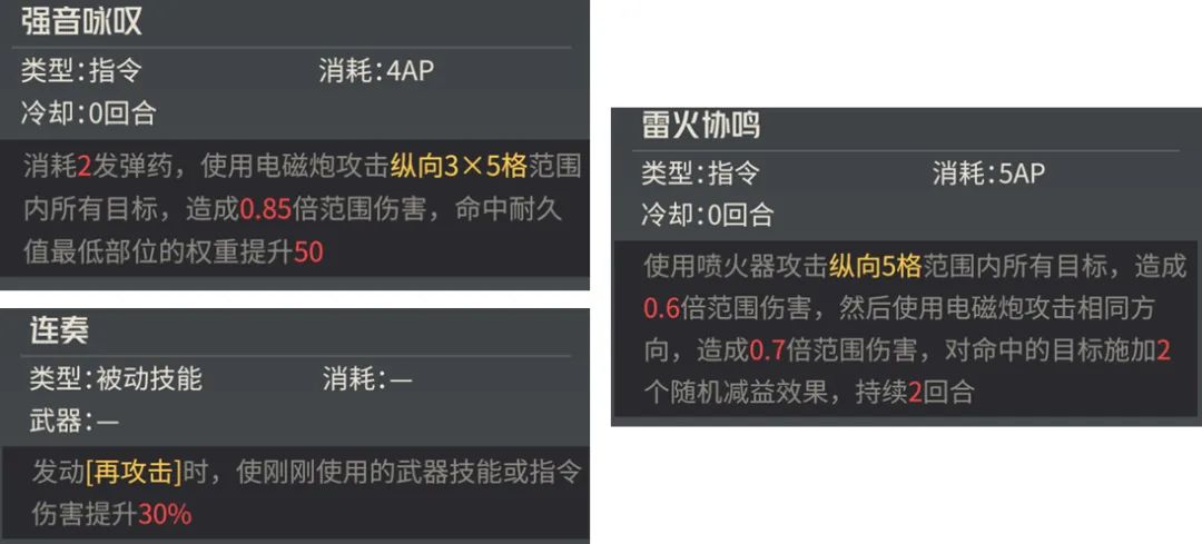然后针对接下来的3个技能,【强音咏叹】具有一定的半瞄准机制,但是这个......瞄准耐久最低的部位也大部分时间不是瞄头的,大家需要注意,且0.85倍的伤害和2发弹药+4AP的消耗大家可以思考一下投资回报比,属于需要提前铺垫后才能产出一定实际效果的输出技能。