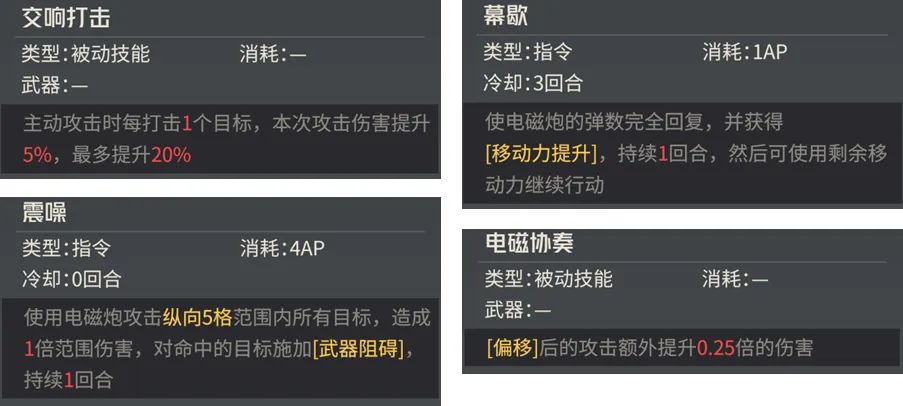 然后电磁炮1倍攻击的技能【震噪】没有瞄准机制,唯有一个【武器阻碍】的效果,应该更多是为了为了PVP而设的技能。