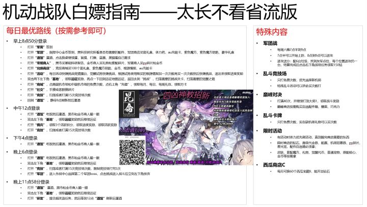 包括白嫖攻略,竞技场、机师、机体节奏榜,限制、深渊、佣兵阵容推荐,配件详解等,其他攻略内容在共享文档持续更新中~