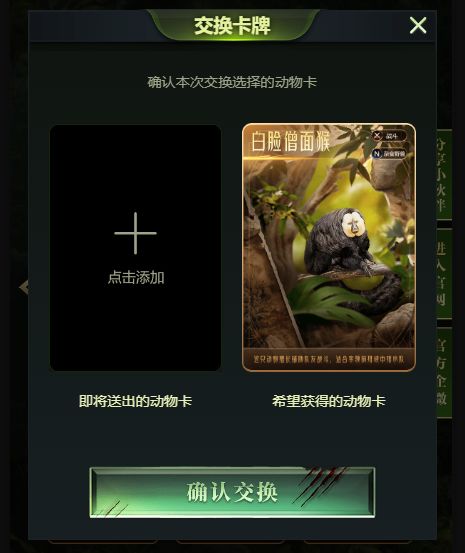 收集到的动物图鉴卡片,可以送给好友或与好友交换。点击想要解锁的动物图鉴卡片,添加多余的卡片即可交换。只有1张卡片无法交换,需拥有2张及以上卡片才能交换哦。