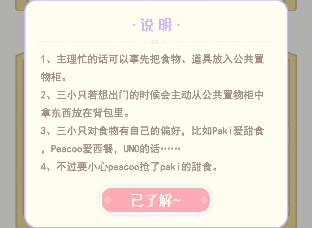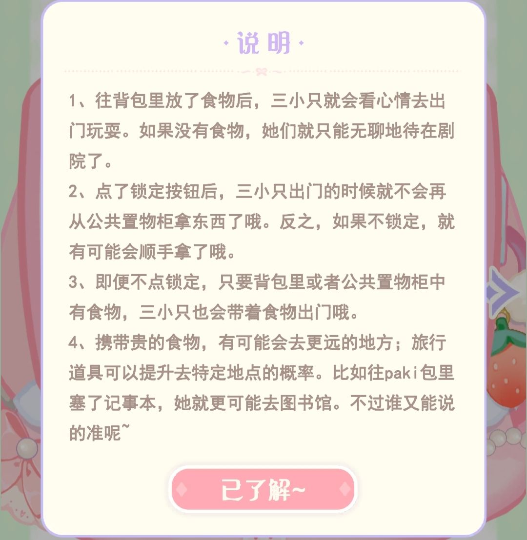 ❶若背包不锁定 崽崽可在公共置物柜中顺走自己想要的物品 可能会提高出行概率