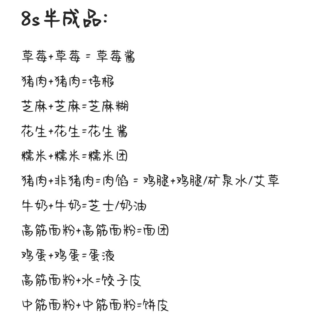 【字数限制完整菜谱在图片里】【注意:艾草菜谱不在菜谱图鉴中!】【新增星光镇居民菜谱第二弹~】1h鸡蛋+芝麻+中筋面粉=蛋黄酥1.5h红糖+烤饼=枫糖松饼白菜+猪肉=梅菜扣肉猪肉+白菜+...