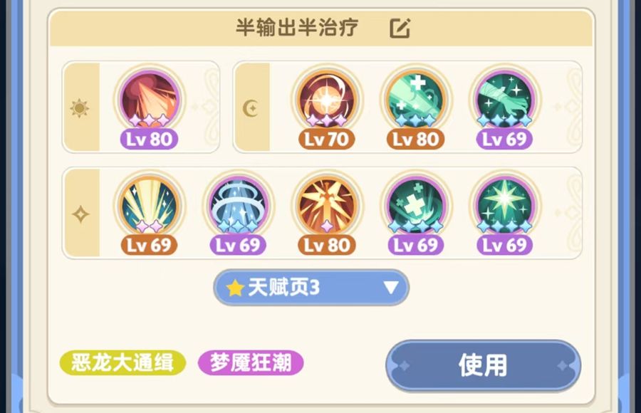 在打龙和梦魇的过程中,我发现治疗的压力不是很大,反而是输出压力比较大,毕竟算是竞速模式。因此,我在打这两个副本的时候会对治疗技能进行微调,在能够稳定血线的情况下增加一些输出。具体配置如下图所示: