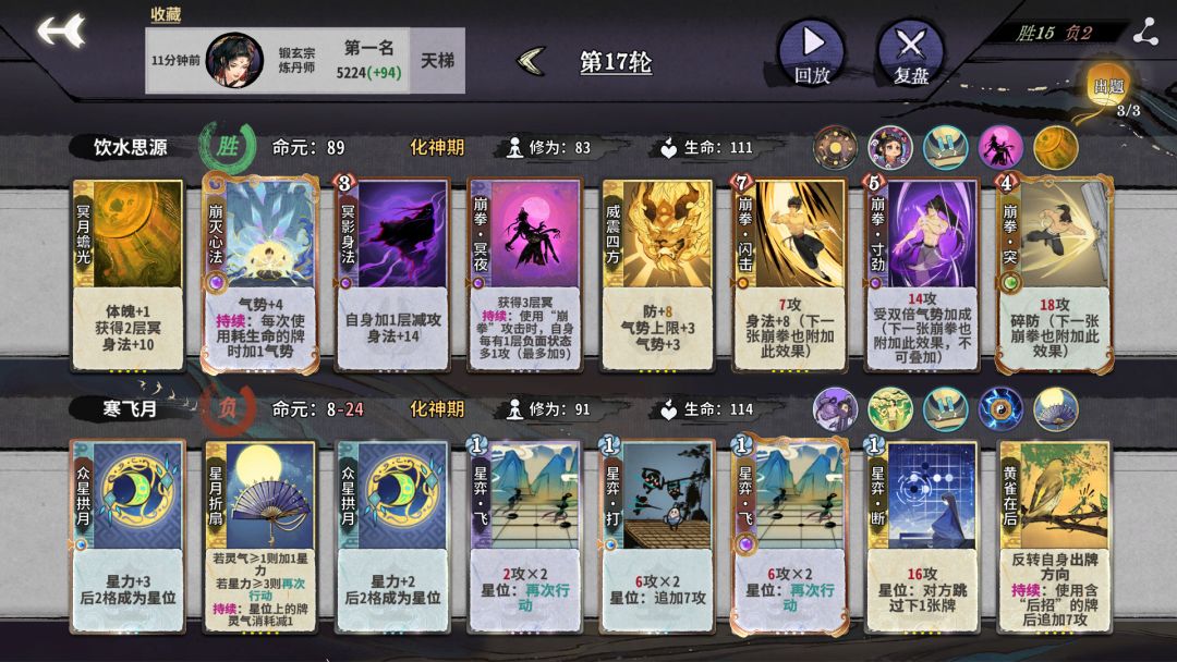以上就是我的思路分享,总结一下不拿疯魔不锻体原因:一个是前期不需要抱气法,能拉满保证不输。中期上本节奏好,过渡舒服,不用纠结锻体。同时目前环境叶冥冥崩拳本来就很多,金丹多拿1修为意味着元婴后所有内战基本稳定先手,根据我体验下来80%以上的对局只要我后手就是输。所以真的可以说先手就是赢。也正因为这样,体魄对于这套卡组就一点用没有。我们不能手上留牌想着转百杀,转丹毒。而且拿疯魔很大一个理由就是后期可以玩百杀,但是百杀后期也得四动杀,而且伤害想要很高得100体魄。虽然百杀血量厚,后期灵活上限高,但是牺牲了前期的稳定性,总的下来我觉得就算吃鸡率都甚至还不如崩拳体系。还有一点就是,有些人认为疯魔会给元婴提供2冥,能增加冥夜伤害。但这里就慢了一动,我后面再多打一张崩拳不是更好呢。